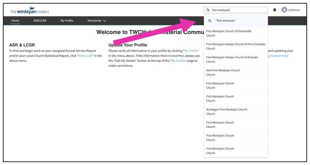 Use the universal search at the top of the Ministerial Community to search for your church.