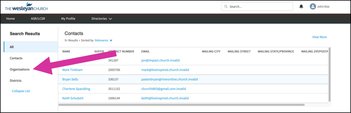 To view a full list of churches, click the “Organizations” tab on the left-hand side.