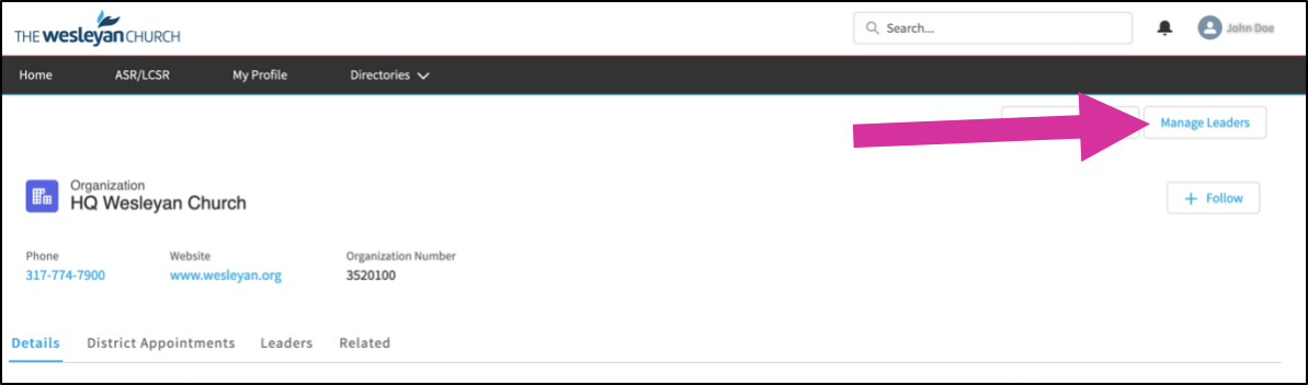 Click your church name to open the church profile. Once open, click “Manage Leaders” in the top-right corner.